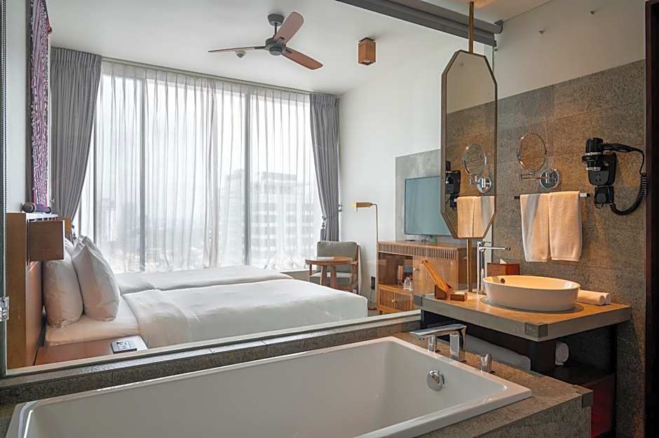 Guests will have a special experience as this twin room features a hot tub. Offering free toiletries and bathrobes, this twin room includes a private bathroom with a bath, a shower and slippers. The twin room offers air conditioning, a tea and coffee maker, a safe deposit box, a flat-screen TV with cable channels, as well as city views. The unit offers 2 beds.